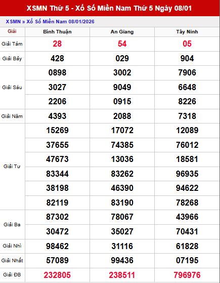 Dựa trên việc tổng hợp kết quả XSMN kỳ mở thưởng gần nhất, kết hợp phân tích tần suất lô tô theo ngày Thứ 5, chu kỳ gan – rơi số, cùng xu hướng dịch chuyển đầu đuôi giai đoạn đầu năm, các chuyên gia đưa ra bộ dự đoán xổ số miền nam 15 tháng 01 năm 2026 mang tính tham khảo cho 3 đài Bình Thuận – An Giang – Tây Ninh như sau: